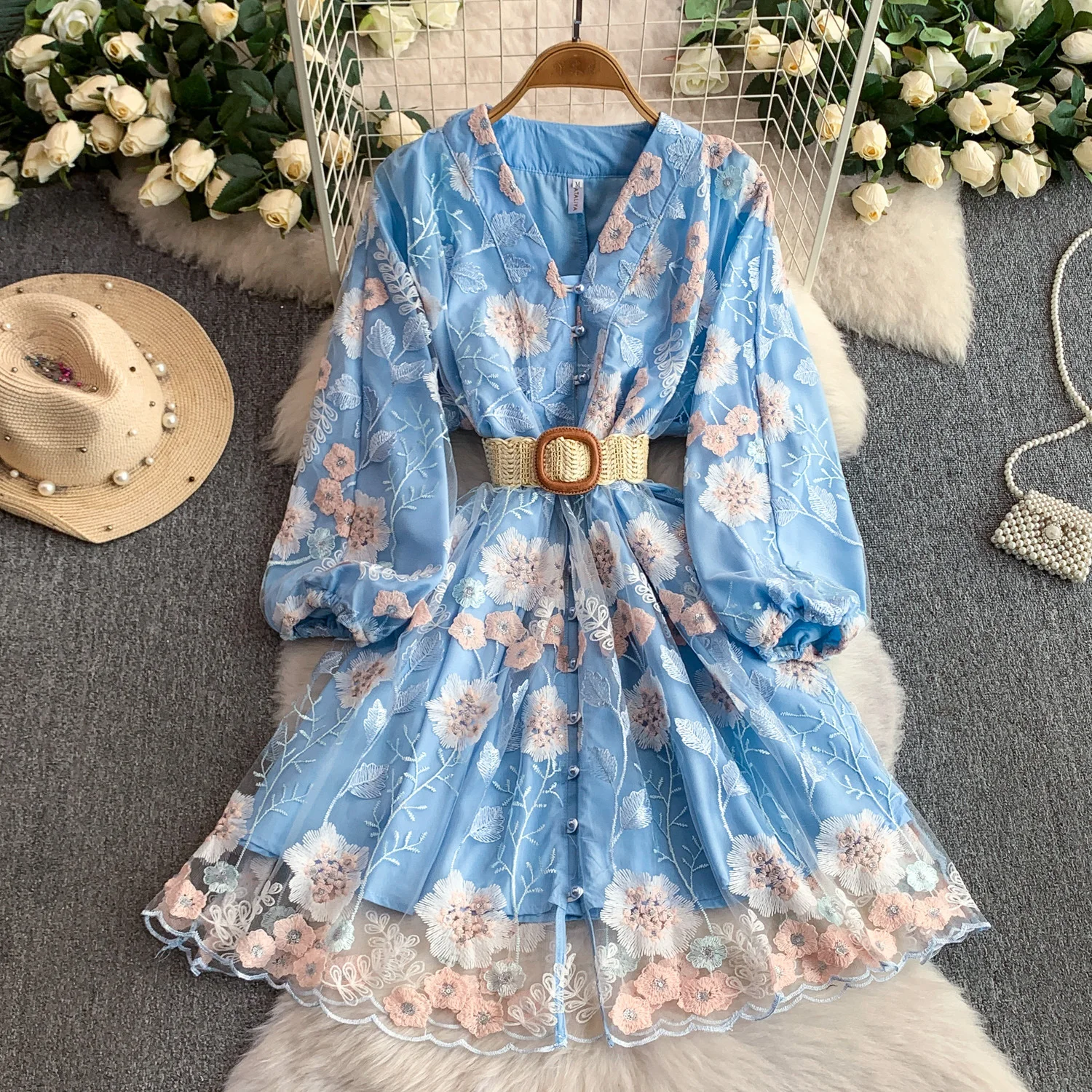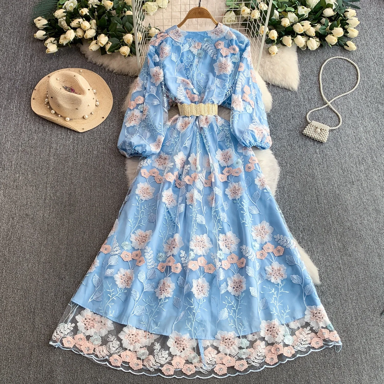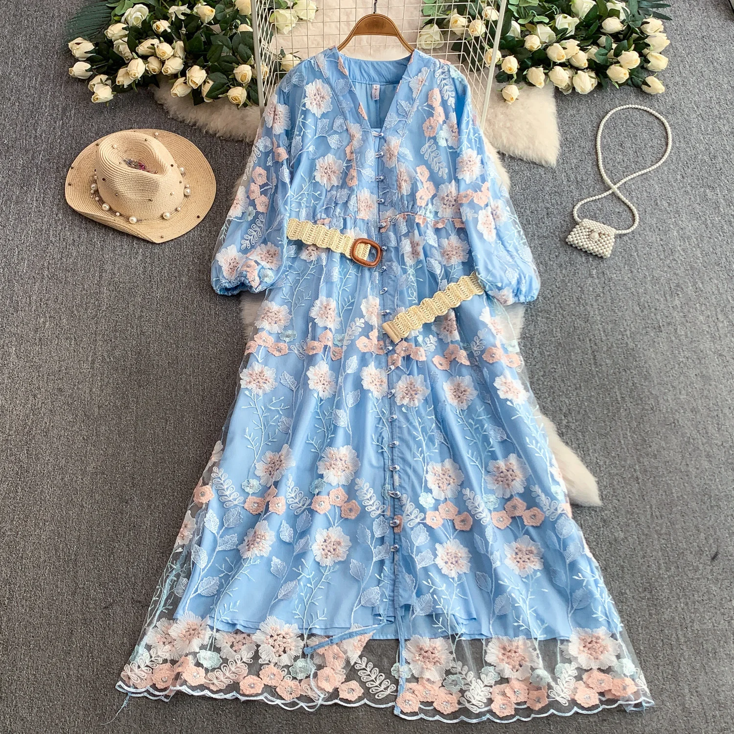 Summer Roman V-Neck Tunic Bandage Casual Maxi Dress for Women Lantern Sleeve Empire Embroidery Mesh Dress